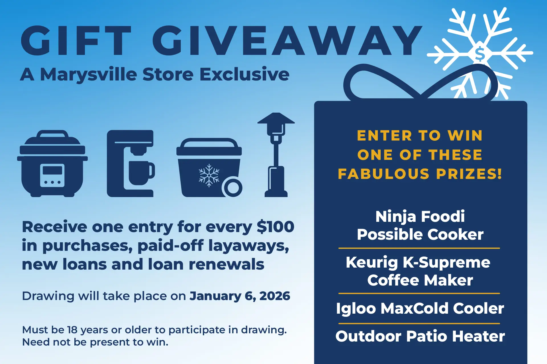 The tradition is back again this year exclusively in our Marysville location. Enter to win fabulous prizes, just for doing business with us this holiday season!
